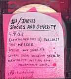 Species and Severity (Imvated; Belgium) 3-inch CDR $8 Imvated catalog: "a little popalbum by two England hoolies Andy Jarvis and Joincey [Wagstaff]. this album was once set to flames by a guy called Greg Clucas." In this case, "pop" means improvised "songs" done in the free-noise manner. You might remember Jarvis and Joincey from their associations with Phil Todd and Betley Welcomes Careful Drivers (Jarvis/Joincey/Todd, Target Shoppers, Anna Planeta, Green Monkey, etc).