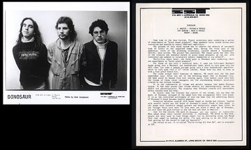 1987 press kit for Dinosaur (before they were Jr.) from SST Records. With 8x10 glossy photo, glossy bio with the same photo printed on back, and a single page of reviews reprinted from Forced Exposure, Spin, Blatch, Matter, Boston Rock, NME, Melody Maker, and Sounds. The bio and press reprints are stapled together.