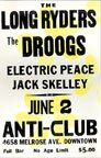 The Droogs, The Long Ryders, Electric Peace, and Jack Skelley -- 14" x 22" concert poster for June 2, 1982 at The Anti-Club, Los Angeles. Printed on heavy stock; black and white withe yellow flower designs
