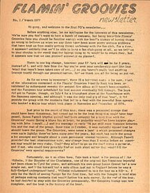 Flamin' Groovies Newsletter # 1, March 1977. 8.5" x 11", published by the Flamin' Groovies Fan Club. From the mimeograph machine of Greg Shaw at Bomp Records comes this 2-sided Groovies newsletter, sent to members of the U.S. fan club in '77. The major news was the arrival of guitarist Mike Wilhelm in the band.