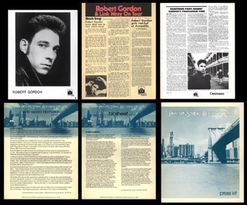 1978 Private Stock press kit for Fresh Fish Special LP: 8x10 glossy photo; 1-page bio; 1-page "radio record information" on Fresh Fish Special; 5-page booklet "Robert Gordon & Link Wray On Tour" with reprints of reviews (Washington Post, Rock Beat, Daily Texan, Rock Around The World, Baton Rouge State-Times, Chicago News); 3-page reprint of reviews from Crawdaddy and The Good Times (by Kurt Loder); and it all comes in a Private Stock Records glossy folder.