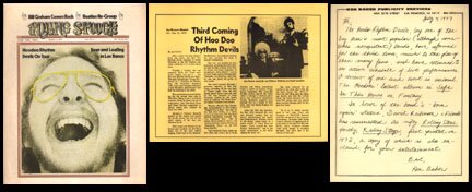 Press reprint from San Francisco Chronicle by Joel Selvin; promo letter from publicity man Ken Baker; and a copy of RULING STOOGE magazine, an 8-page tabloid parody of ROLLING STONE from 1972 with references to the Hoodoo Rhythm Devils scattered throughout.