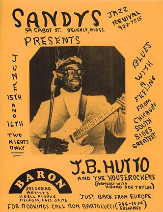 J.B. HUTTO & THE HOUSEROCKERS gig flyer 1978 $30 8.5" x 11" flyer for June 15 and 16, 1978 at Sandy's Jazz Revival in Beverly, Massachusetts.