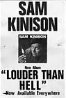 Heavy sign poster promoting Sam's Louder Than Hell LP -- 15" x 22"; black and white; a few small tears from where it was stapled to a phone pole; looks good.